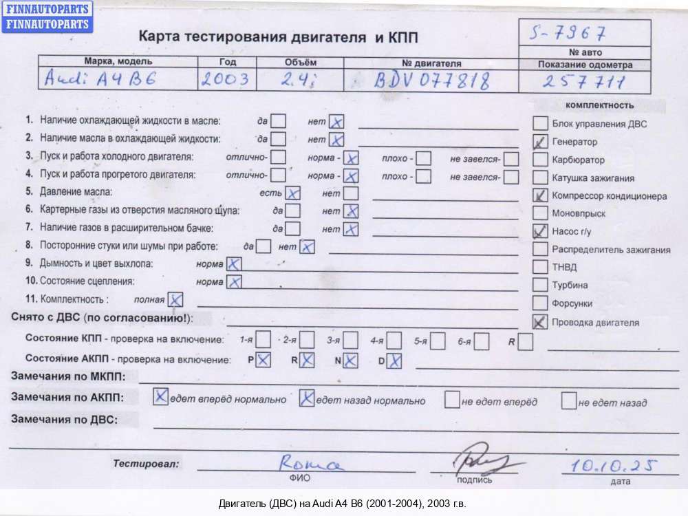 | Ростов-на-Дону | 2003 | 06C100031, 2003, 3л, Бензин, Инжектор, ASN, ASN037351, 06C100031, Универсал, серый, Фото не актуально, с запчасти отделены: Генератор, ASN037351 | - | Н | Т | КК, прокручивается, состояние ГРМ - нормально, поддон - нормально, клапанная крышка - нормально, эмульсия - нет, 1 массовый, бита защита ГРМ, биты датчики положения распредвала, сломан патрубок воздушного фильтра., | |||
